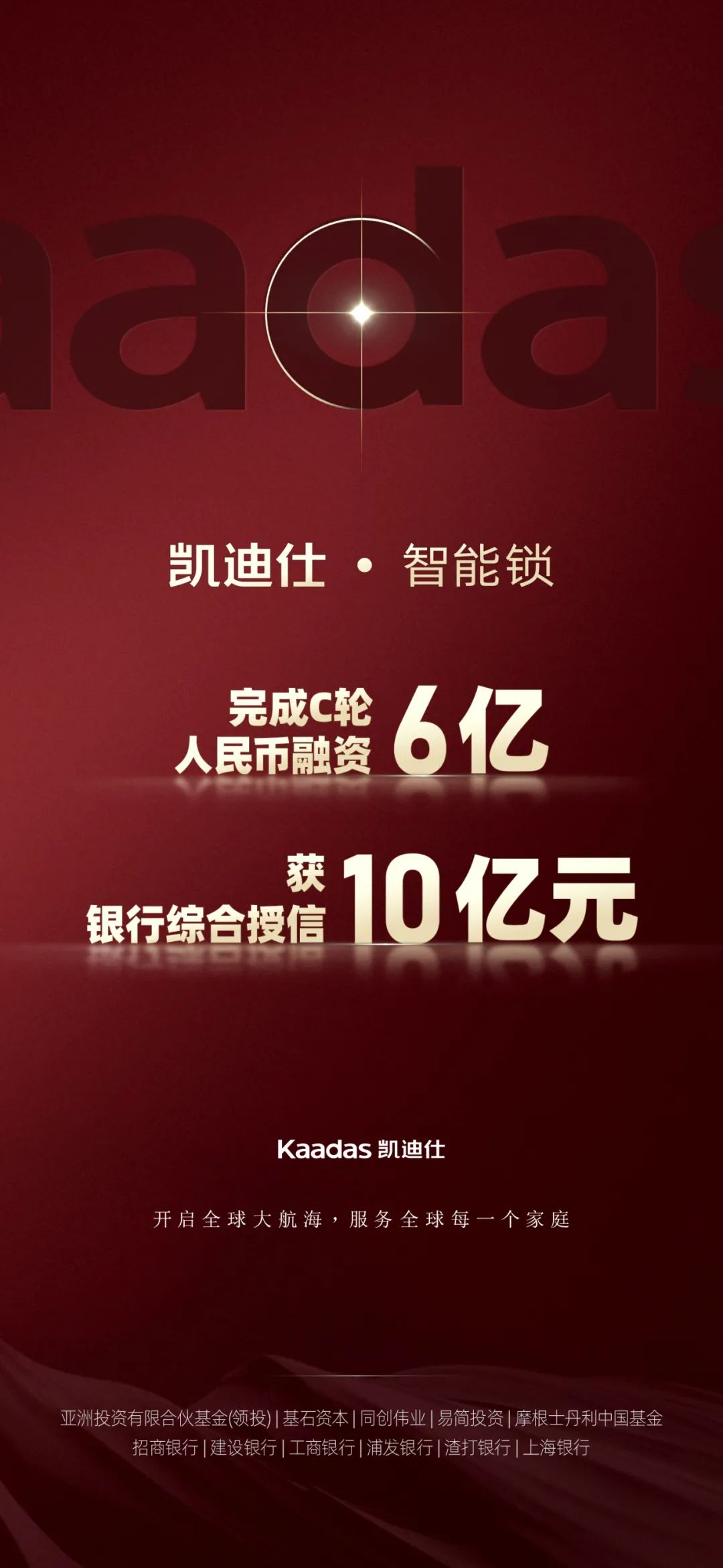 近日,Kaadas伟德app安卓版下载正式完成C轮融资,单轮融资金额达6亿人民币。本轮由亚洲投资有限合伙基金(以下简称“亚投基金”)领投,基石资本、同创伟业、易简投资、摩根士丹利(中国)股权投资管理有限公司管理的人民币私募股权投资基金(以下简称“摩根基金”)跟投。此外,品牌另获招商银行、建设银行、工商银行、浦发银行,渣打银行、上海银行六大银行共计10亿元综合授信。