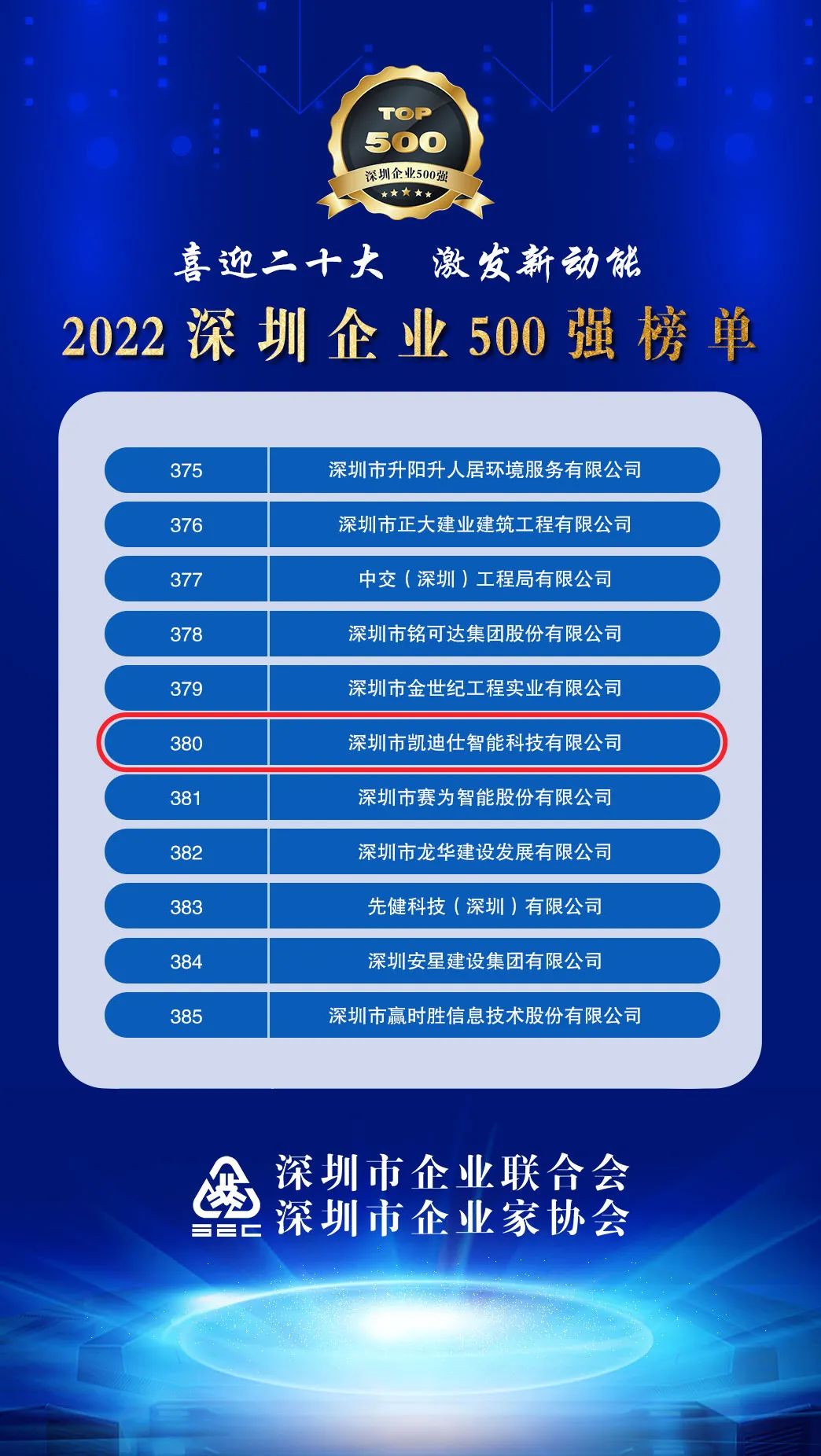 今日,深圳市企业联合会、深圳市企业家协会(简称深圳企联)正式发布“2022深圳企业500强榜单”及《2022深圳500强企业发展报告》。Kaadas伟德app安卓版下载强势登榜,位列第380位!