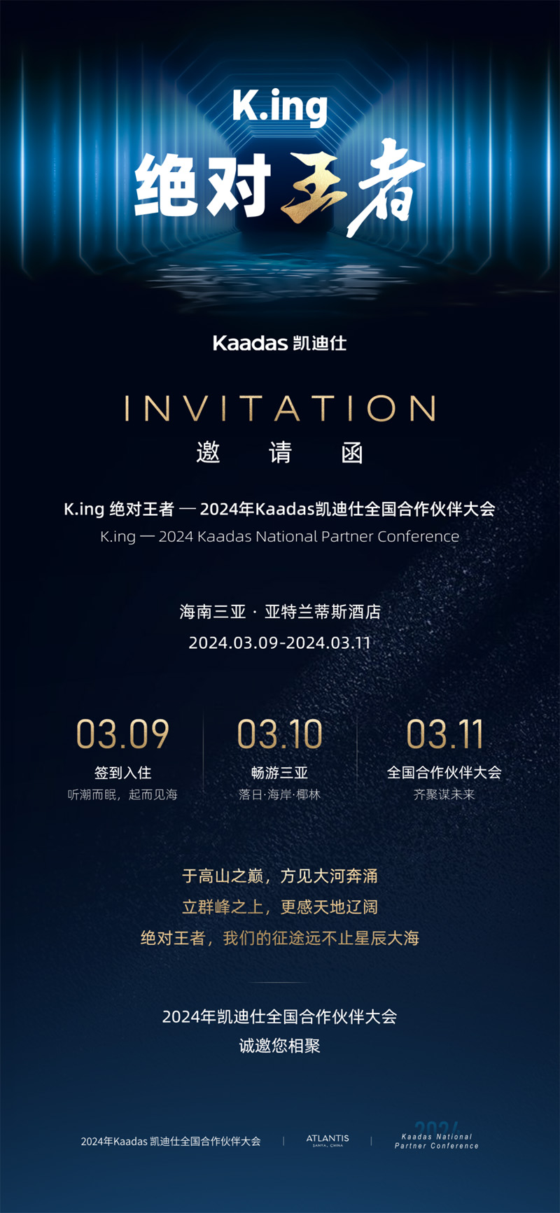 K.ing绝对王者——2024年Kaadas伟德app安卓版下载全国合作伙伴大会,3月三亚·亚特兰蒂斯酒店,不见不散!