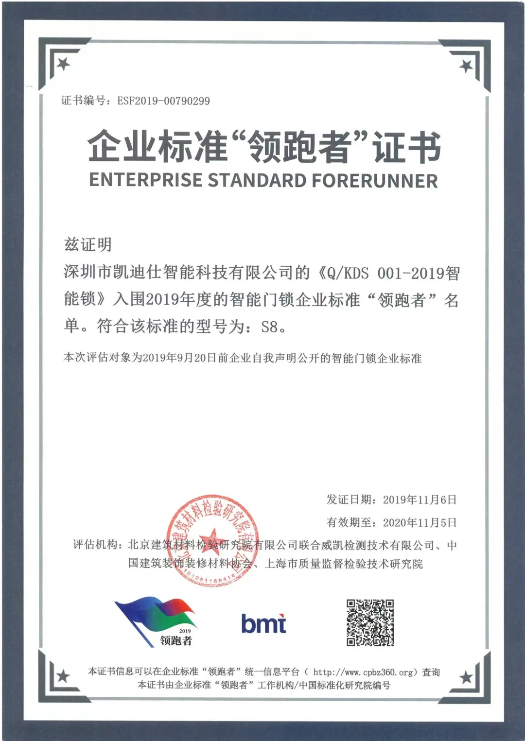早在2018年,经国务院同意,市场监管总局、国家发展改革委、科技部、工业和信息化部等八部门联合印发《关于实施企业标准“领跑者”制度的意见》(以下简称《意见》),提出强化企业标准引领,树立行业标杆,促进全面质量提升,推动建立企业标准“领跑者”制度的要求。伟德app安卓版下载凭借S8智能锁,成为行业首批入选企业标准“领跑者”企业之一。