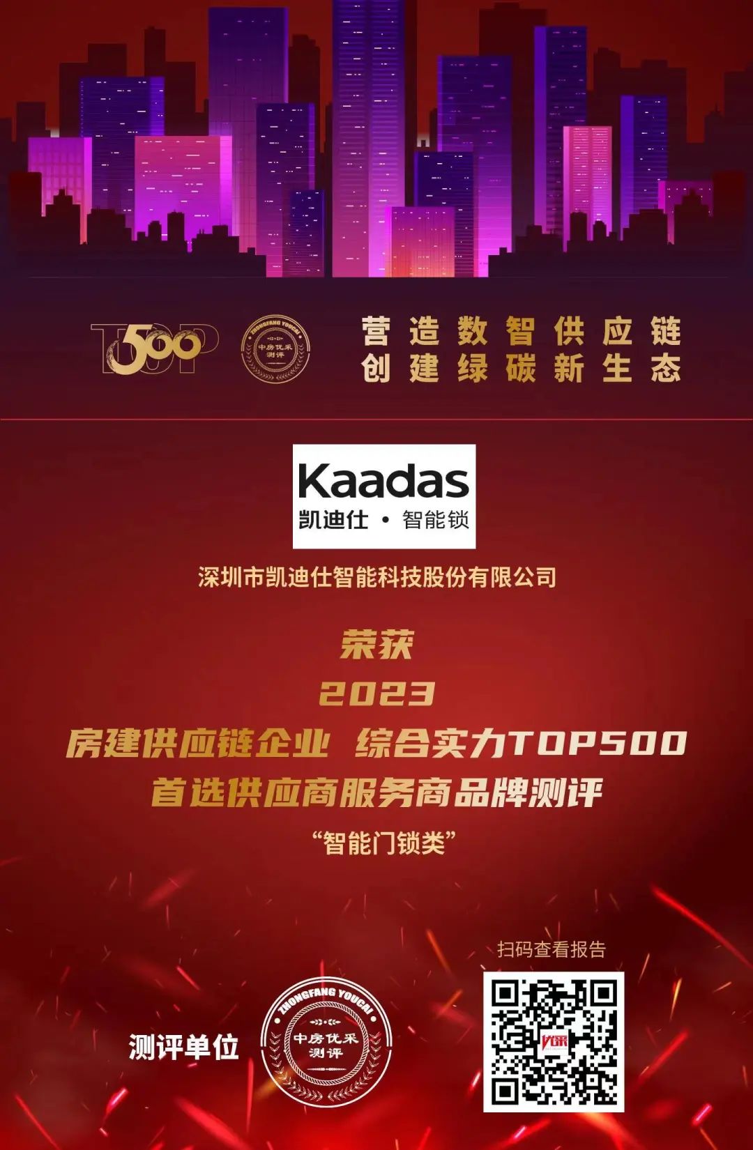 今日,2023中国房地产TOP500测评成果发布会暨房地产企业发展高峰论坛在北京隆重举行。Kaadas伟德app安卓版下载以行业榜首之姿,强势入选“2023房建供应链综合实力TOP500首选供应商·智能门锁类”并被收录入2023年中国房地产业协会5A供应商企业库。自2017年该测评新增智能门锁测评类目至今,伟德app安卓版下载已连续7年入选。