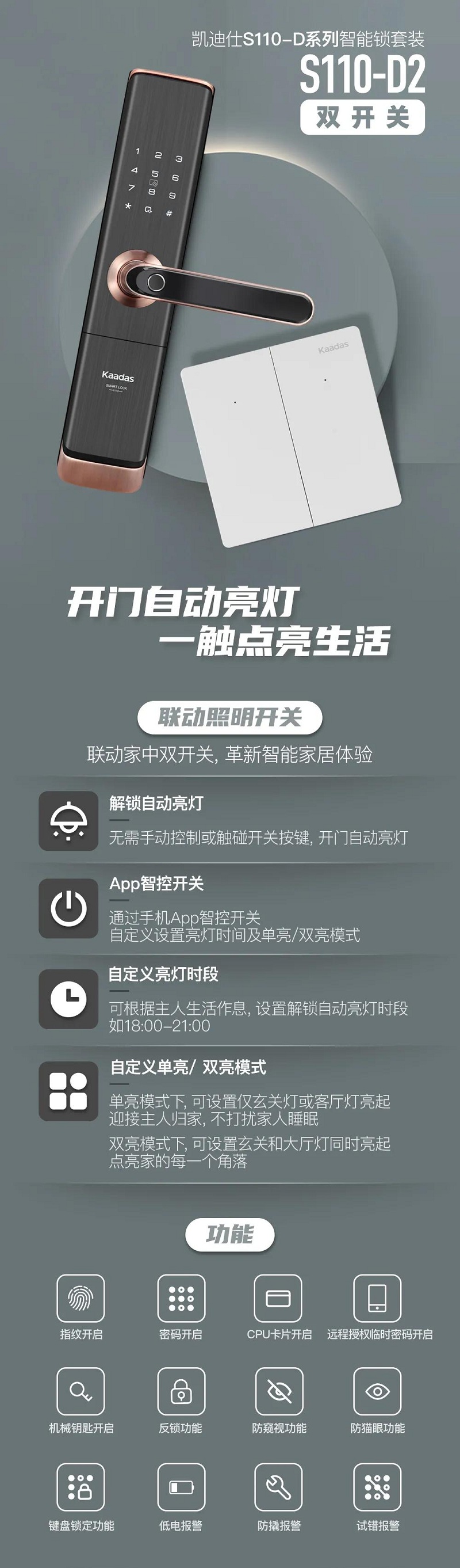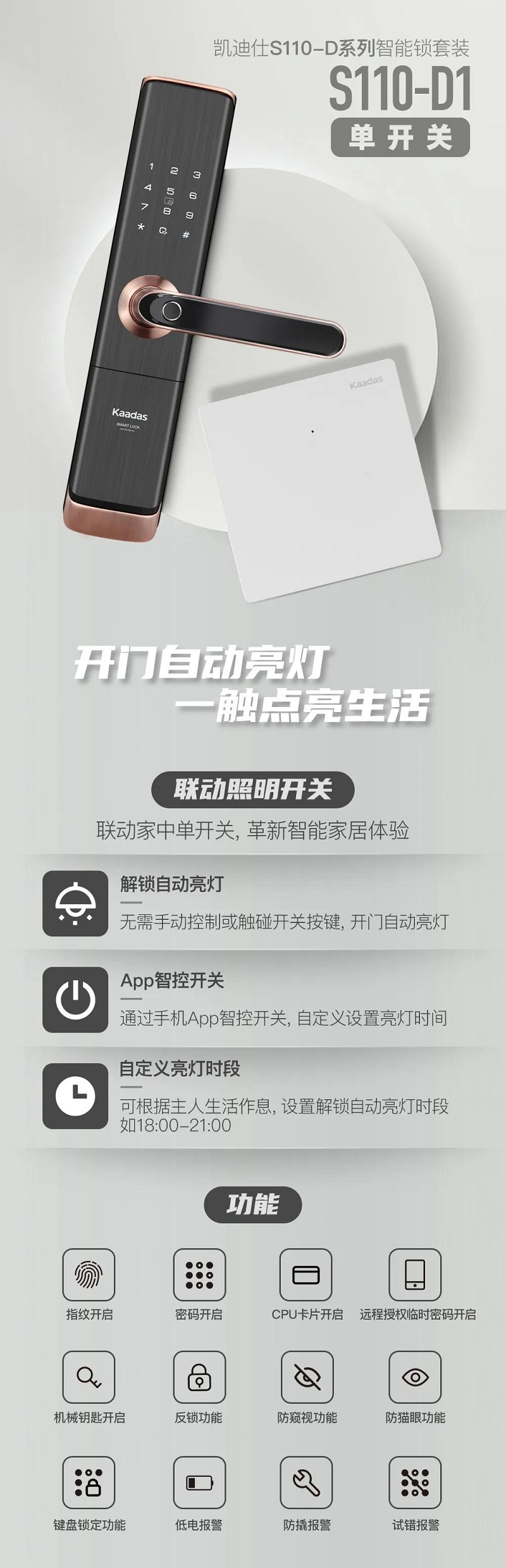 S110-D系列套装可搭配D1单开关或D2双开关使用,联动照明设备,可实现开门自动亮灯。