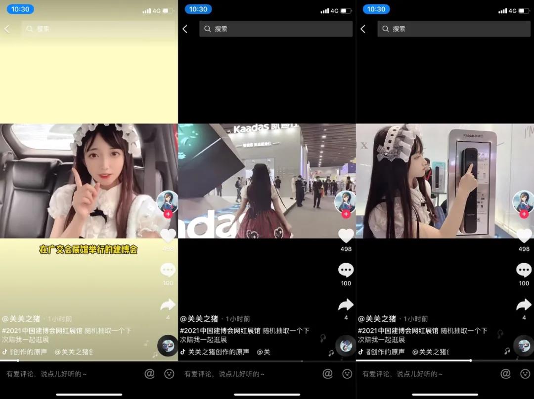 展馆的亮眼细节,吸引了众多参展商及网红达人到场打卡。在搭建初期就吸引了大批参展商打卡分享,首秀当天,吸引抖音百万粉丝网红@小太阳Janet、抖音百万粉丝达人&B站UP主@关关之猪 到展馆打卡并现场直播、一兜糖达人&认证种草官@杨小馒 到现场进行好物打卡。