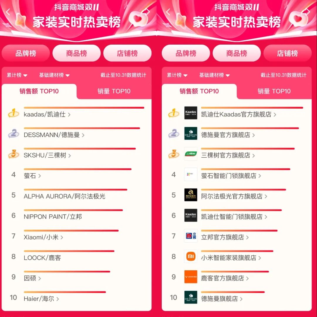 抖音平台同样迎来爆发,斩获抖音商城双11家装实时热卖榜-品牌榜累计销售额与店铺榜累计销售额双料TOP1。